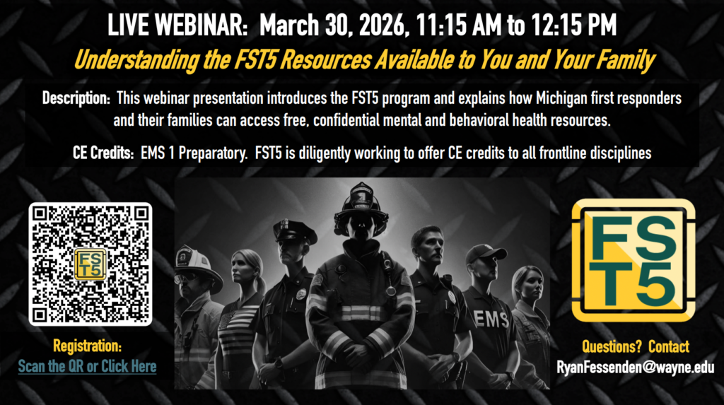 Continuing Education (CE) Credits: This event is approved for 1 Preparatory EMS CE credit through the MDHHS BETP.  CE credits are NOT currently approved for Fire, Law Enforcement, Corrections, or 911 Dispatch. FST5 is actively working to expand CE approval to all frontline disciplines for future events.